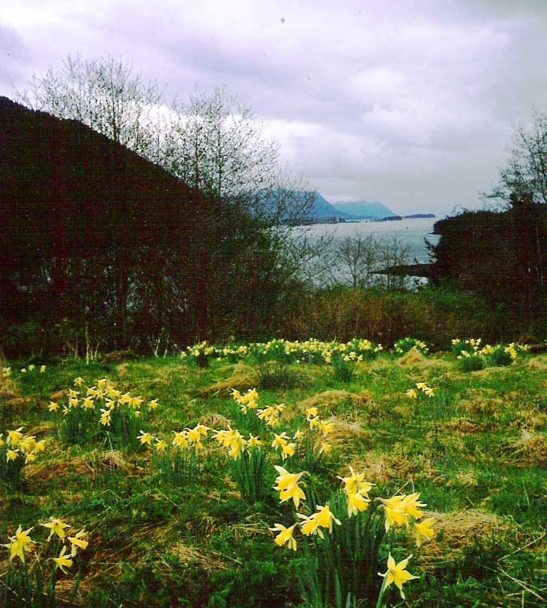 A stormy day, with daffodils. Our springtime view out the front window was stunning, a field of daffodils with the harbour entrance and the misty islands beyond.
