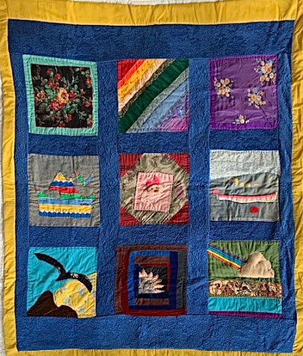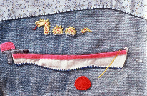 Wendy made a sailboat, Marie a bright rainbow, and her partner Les, a husky pile-driver, stitched a bird in flight. Carol appliquéd a white skiff with bright pink gunwales and a pink outboard motor, tied to a bright pink mooring buoy, with a smiling sea monster swimming by.