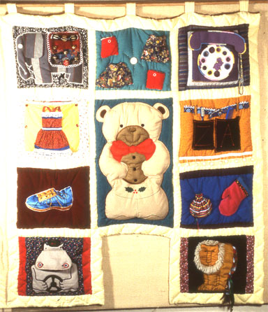 This baby quilt was was created as a wall hanging and an activity board. The lion’s tail is for braiding and there are buckles, buttons, shoelace tying, snaps, a telephone to dial, and a variety of pockets, some with things already in them.